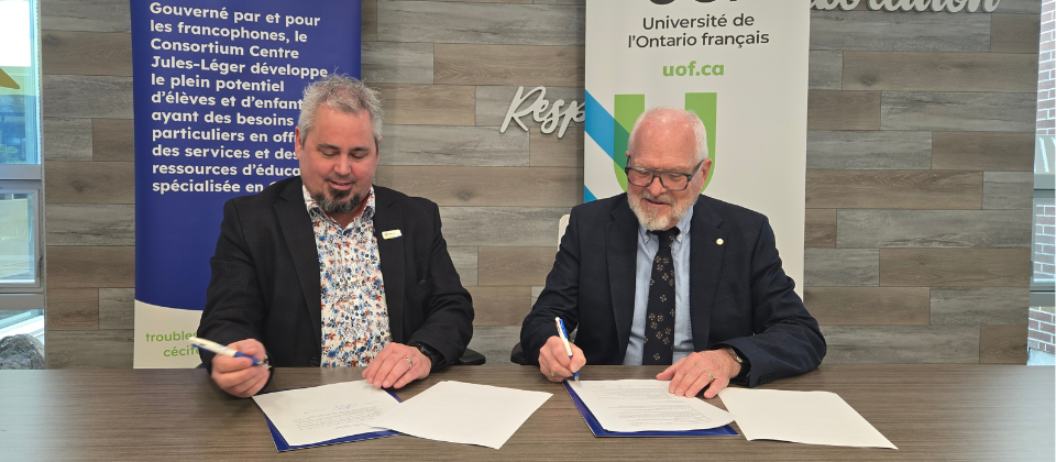 Ottawa, le jeudi 5 mars 2026 – L’Université de l’Ontario français (UOF) et le Consortium Centre Jules-Léger (CCJL) signent un protocole de collaboration destiné à renforcer la langue et la culture francophones en milieu minoritaire. Cette entente marque un prolongement naturel des missions éducatives et culturelles des deux institutions et ouvre la voie à une série d’initiatives communes.